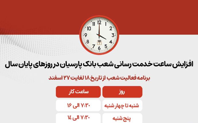 بهمنظور رفاه حال هموطنان گرامی و ارائه خدمات مطلوب و ارزشآفرینی هر چه بیشتر مشتریان، ساعت کاری شعب بانک پارسیان از ۱۸ اسفندماه افزایش یافت.