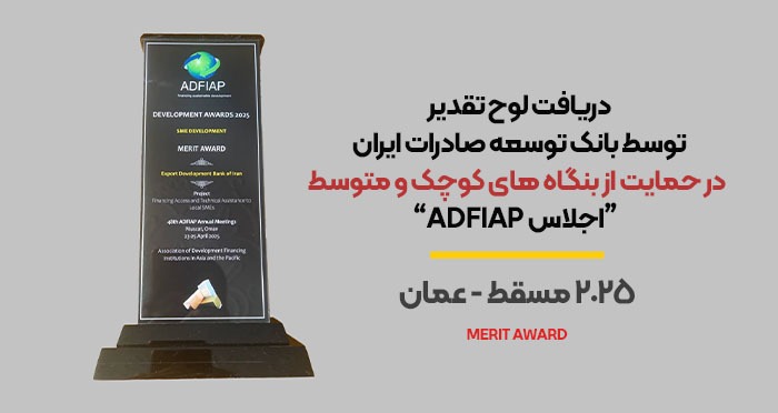 در چهل و هشتمین اجلاس سالانه ADFIAP( ادفیاپ) از عملکرد بانک توسعه صادرات ایران در زمینه حمایت از بنگاههای کوچک و متوسط (SME) صادراتی تقدیر شد.