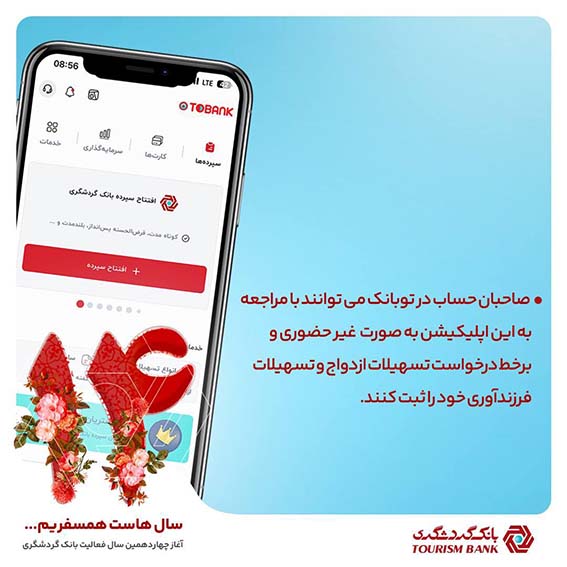 بانک گردشگری که در آستانه ورود به چهاردهمین سال فعالیت خود قرار دارد، با شعار «فراتر از مرزها» حرکتی اساسی به سوی بانکداری الکترونیک و نسل نوین خدمات بانکی را در توبانک آغاز کرده است. هماکنون صاحبان حساب در توبانک میتوانند با مراجعه به این اپلیکیشن به صورت غیرحضوری و برخط درخواست وام ازدواج و وام فرزندآوری را ثبت کنند.