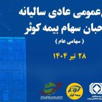 مجمع عمومی عادی سالیانه صاحبان سهام بیمه کوثر، راس ساعت ۸:۳۰ صبح روز شنبه مورخ ۱۴۰۴/۰۴/۲۸ در محل تهران، خیابان سهروردی شمالی، خیابان خرمشهر، پلاک ۲۰۶، ساختمان ستاد مرکزی شماره ۲ بیمه کوثر برگزار میگردد.